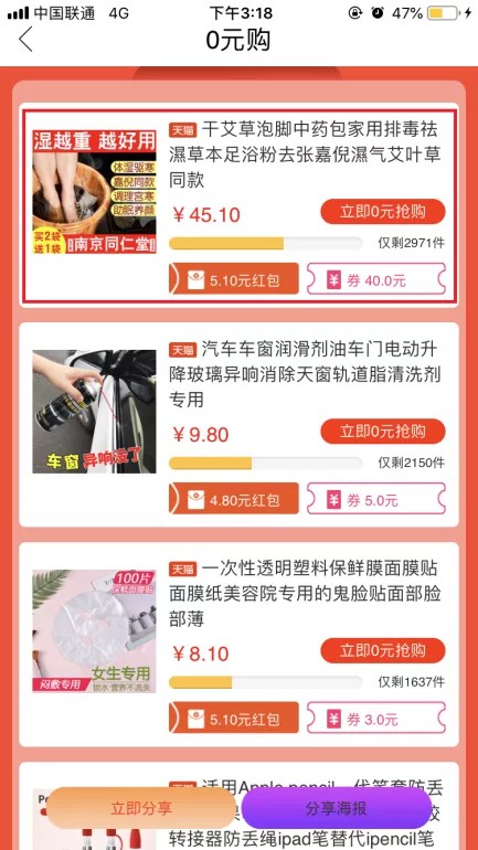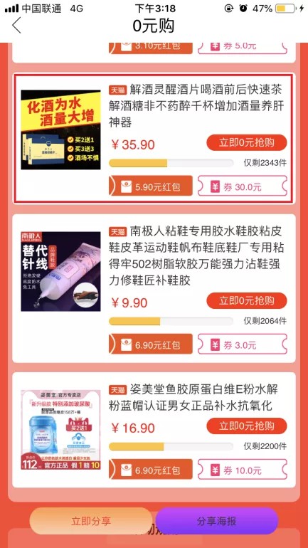 第三步 0元购里有很多商品,不乏原价几十元的,点击商品会打开淘宝APP,在淘宝APP里领优惠卷和红包,领卷后在淘宝里付款购买就是0元。