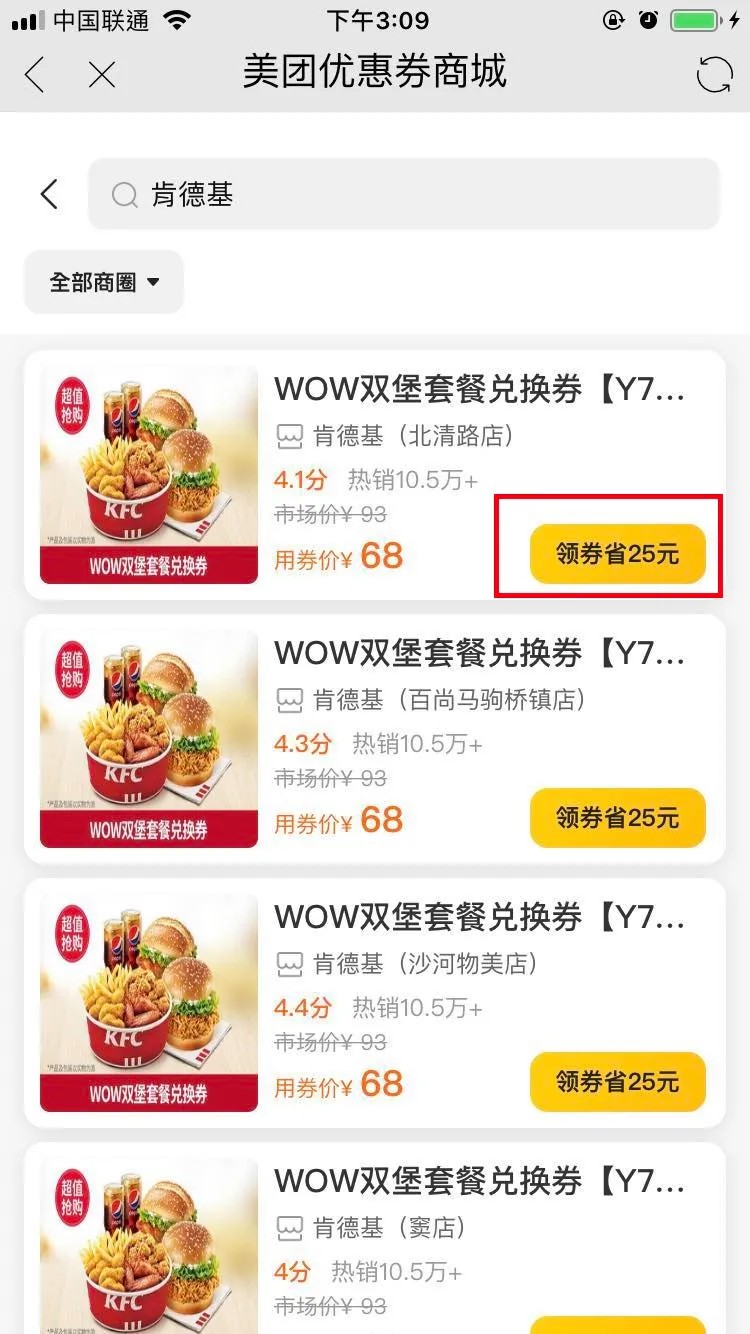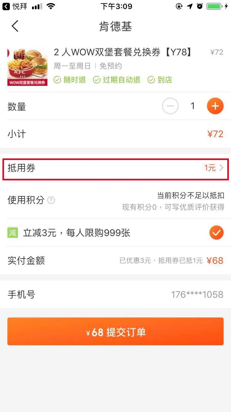 选择抵用卷的界面是这样的,因为肯德基是大牌,卷比较小,1元都是最少的卷了,有部分商品能0.01元就拿下: