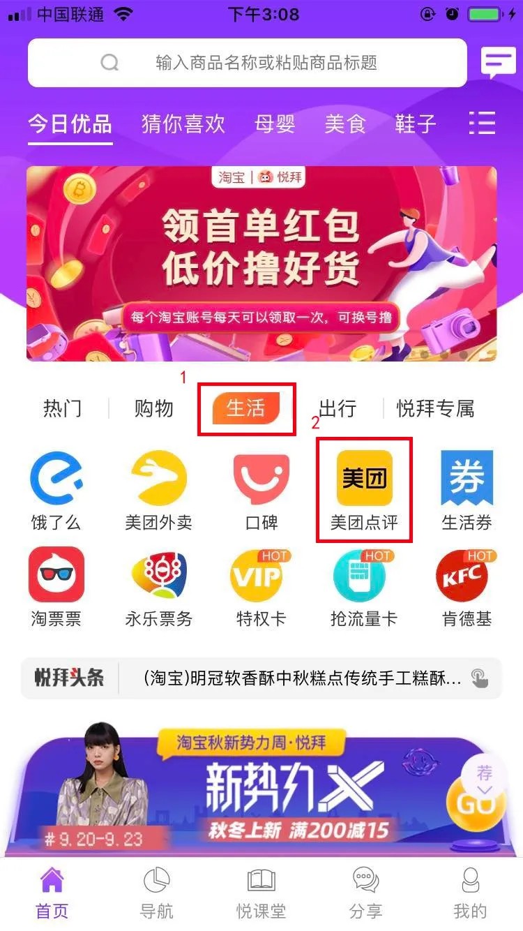 第一步 打开悦拜,点击左下角首页,选择生活,找到美团点评点进去,如图: