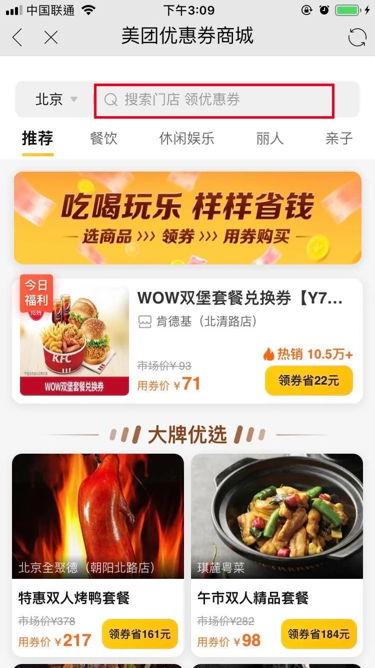 第二步 在顶部搜索你想团购的店的名称,如下图红框位置:这里记得允许APP定位,或者切换到你所在的城市。