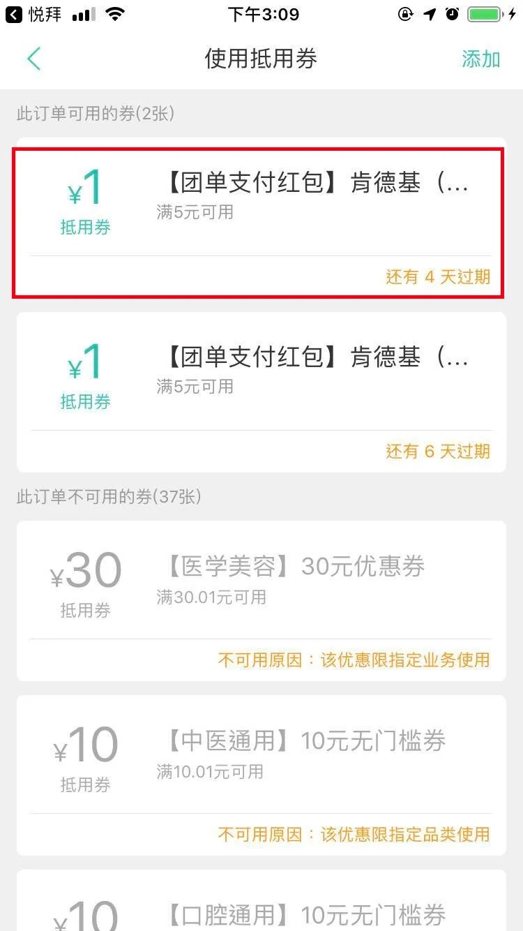 第五步 注意下面画框的位置即抵用卷的位置,默认是没有选择的,点开选择一个卷,这里的卷就是在悦拜APP刚刚领取的,这里是一个满5减1的卷,有的店做活动有隐藏的0.01元购的大卷,最后会上图。团单卷最少都是1元起。如下图: