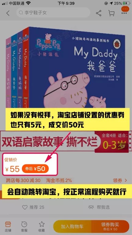 如果没有经过悦buy,成交价格为50元(淘宝有券5元)
