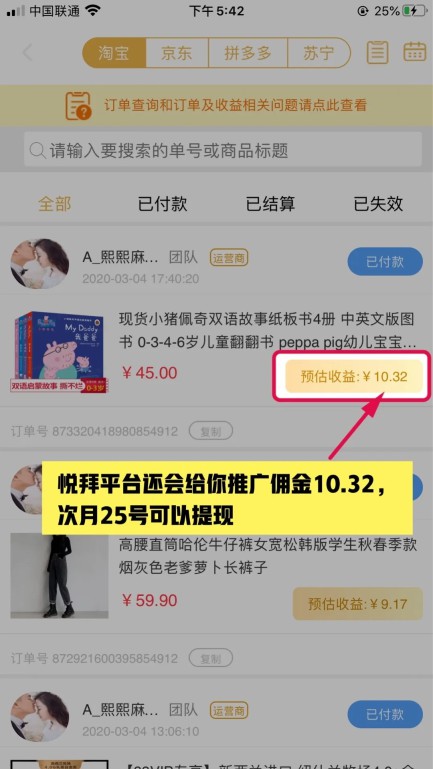 而且打开悦拜,会发现你刚刚下的订单,悦拜平台会返你10.32佣金。