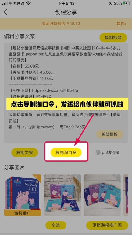 然后点击复制淘口令,发给小伙伴就可以。当小伙伴通过你的链接购买产品时,就可以获取对应的佣金。